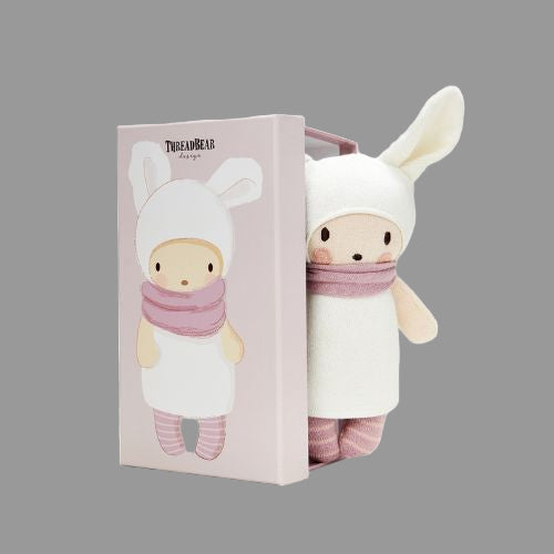 Simple knitted doll for babies by ThreadBear Design Scandi influenced knitted dressed doll called Baby Baba. She is made from soft knitted cotton and and wears a rabbit eared hat. In soft pink and white, this knitted toy is a snuggly comforter. Modern vintage, this toy is a nostalgic childhood companion. A perfect gift or addition to a pram for ultimate cuddle comfort. Presented with a beautiful, printed gift box.