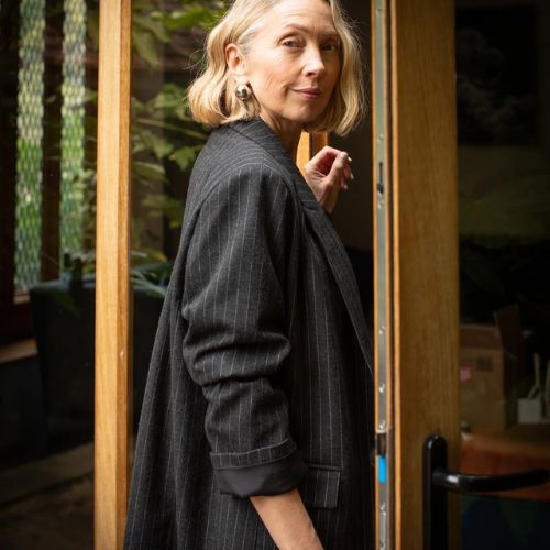 Drew blazer is made in a classic pinstripe wool blend material. Oversized, longline blazer with a welt breast faux pocket as well as two concealed pockets with a flap. Drew is fully lined, with one button to front. Sleeves can be easily rolled.