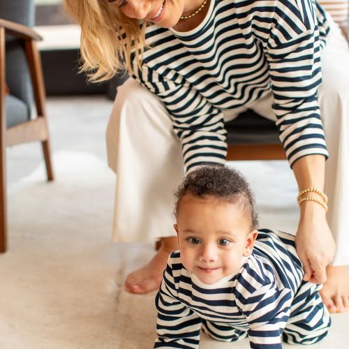 Made from a soft cotton blend loop-back fabric, the Rebecca Top features a relaxed boxy fit with long sleeves. Designed with a classic round neckline, it is finished with a navy binding at the back neck for a clean, considered detail