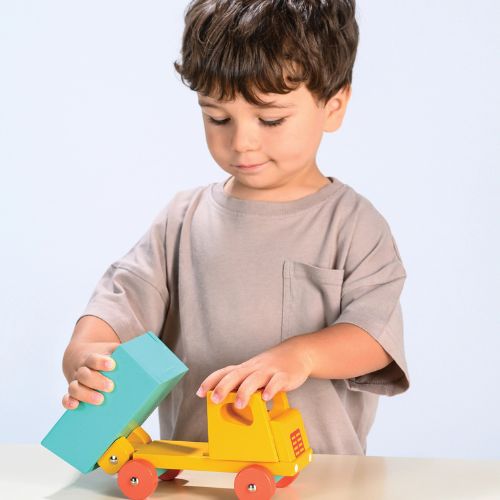 Based on a retro design, the simple clean lines give this traditional toy a refreshing look and feel. A classic big yellow lorry with tipping back part and orange wheels.